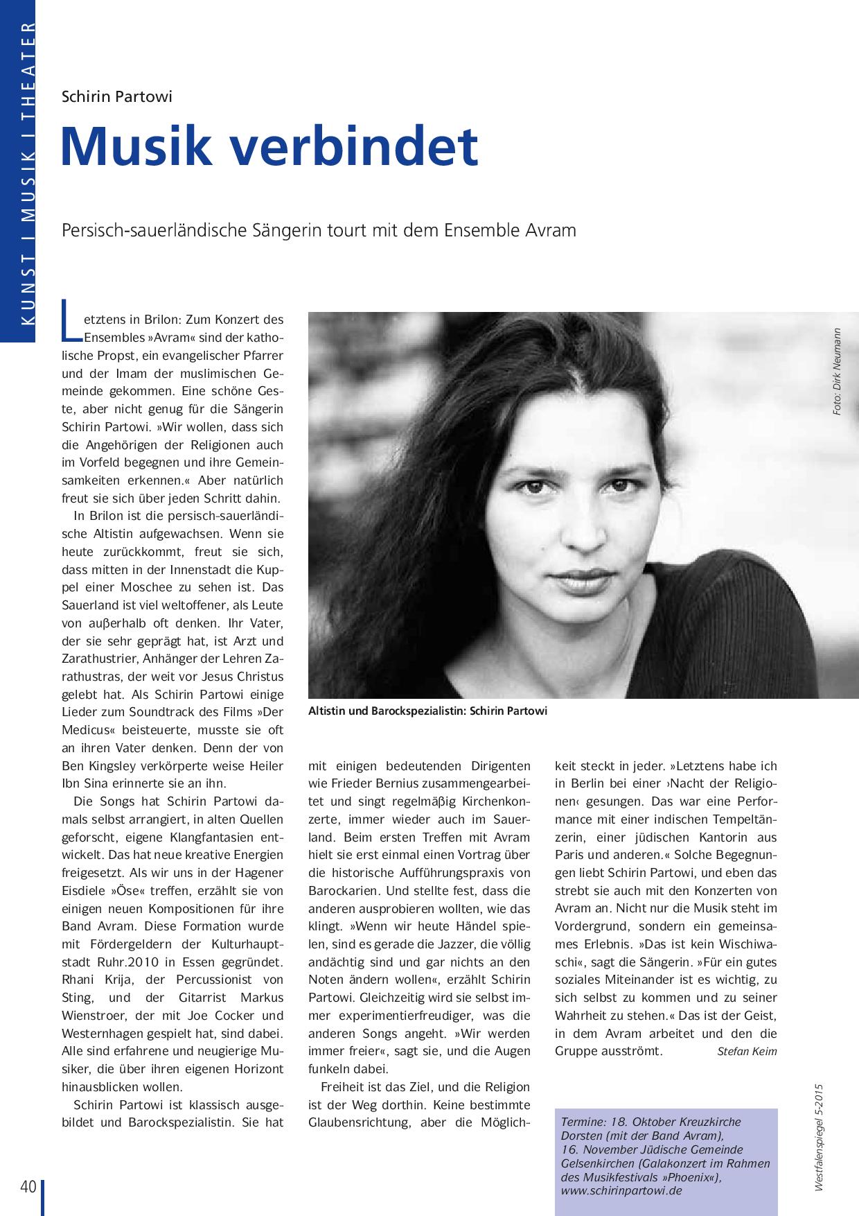 Letztens in Brilon: Zum Konzert des Ensembles »Avram« sind der katholische Propst, ein evangelischer Pfarrer und der Imam der muslimischen Gemeinde gekommen. Eine schöne Geste, aber nicht genug für die Sängerin Schirin Partowi. »Wir wollen, dass sich die Angehörigen der Religionen auch im Vorfeld begegnen und ihre Gemeinsamkeiten erkennen.« Aber natürlich freut sie sich über jeden Schritt dahin. In Brilon ist die persisch-sauerländische Altistin aufgewachsen. Wenn sie heute zurückkommt, freut sie sich, dass mitten in der Innenstadt die Kuppel einer Moschee zu sehen ist. Das Sauerland ist viel weltoffener, als Leute von außerhalb oft denken. Ihr Vater, der sie sehr geprägt hat, ist Arzt und Zarathustrier, Anhänger der Lehren Zarathustras, der weit vor Jesus Christus gelebt hat. Als Schirin Partowi einige Lieder zum Soundtrack des Films »Der Medicus« beisteuerte, musste sie oft an ihren Vater denken. Denn der von Ben Kingsley verkörperte weise Heiler Ibn Sina erinnerte sie an ihn.