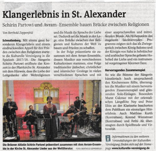 "Mit einem ganz besonderen Klangerlebnis und einem eindrucksvollen Apell für den Frieden zwischen den Religionen startete die Kulturelle Vereinigung in die Spielzeit 2017/10. Die Sängerin Schirin Partowi eröffnete das Konztert in der Pfarrkirche St. Alexander mit dem Hinweis, dass die Liebe der Leitgedanke aller Weltreligionen und die Musik die Sprache der Liebe sei. Dadurch sei die Musik in der Lage, eine Brücke zwischen den Religionen und Kulturen der Welt zu bauen und Frieden zu schaffen.
